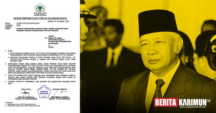 Jakarta, beritakarimun.id – Dewan Pimpinan Pusat (DPP) Partai Golongan Karya (Golkar) mengeluarkan instruksi resmi kepada seluruh Dewan Pimpinan Daerah (DPD) tingkat provinsi dan kabupaten/kota se-Indonesia untuk menyelenggarakan acara syukuran dalam rangka menyambut penganugerahan gelar Pahlawan Nasional kepada Jenderal Besar TNI Haji Muhammad Soeharto.